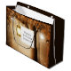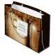 Gift bag with a whimsical enchanting illustration in rich brown and yellow colours. A magical mystical forest with a large tree holding an old fashioned lantern. Fairy lights dancing all around. An enchanting wonderful design.