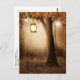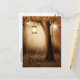 Postcard with a whimsical enchanting illustration in rich brown and yellow colours. A magical mystical forest with a large tree holding an old fashioned lantern. Fairy lights dancing all around. An enchanting wonderous design.