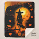 This magical orange Gothic Valentine’s Day blanket design features the silhouette of a witch standing against a glowing white moon. The design includes an orange shadowy reflection of the witch below and a background with bats flying in the night sky with orange hearts. Personalised with a customisable monogram at the bottom, this blanket makes a heartfelt gift or a cosy addition to your home décor, perfect for celebrating the season of love with a witchy vibe.