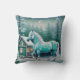 "Magical horse in enchanted forest" is an concept art design fantasy featuring a fantasy green turquoise horse running in the enchanted forest in front on a green log cabin somewhere in the snowy mountains.
