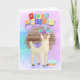 Adorable birthday card with a colourful llama working to be a llamacorn (notice the headband), and a birthday cake. Inside messaging reads: "Here's hoping your birthday is as magical as a llamacorn."