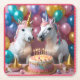 Pictured Are Two White Unicorns Wearing Party Hats, Balloons, And A Birthday Cake Celebrating Their Birthday.