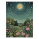 This enchanting illustration captures a magical night scene in a blooming meadow. A full, luminous moon and a sprinkling of golden stars, including a crescent moon, light up a swirling, textured teal and dark blue sky. The foreground is a vibrant field of wildflowers in shades of pink, yellow, blue, and white, with lush green grass and rolling hills behind them. In the midground, a serene forest of trees with thick, green canopies stretches across the landscape, silhouetted against the starry sky. The overall feeling is one of peace and wonder, like a dreamscape from a fairytale.