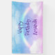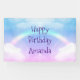 Birthday banner with a soft and lovely background image. Pastel blues and pink clouds with a magical rainbow.