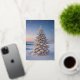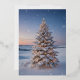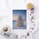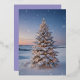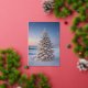 A breathtaking vertical image featuring a beautifully snow-laden Christmas tree, adorned with warm, glowing lights. The tree stands majestically in a pristine, snow-covered winter landscape under a soft twilight sky, where the last rays of sunset paint the horizon in gentle pinks and oranges. Delicate snowflakes drift down, completing this serene and festive winter scene. Perfect for holiday cards, winter decorations, or festive prints.