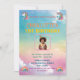 This is a pastel-coloured unicorn-themed birthday invitation for a child's first birthday. It features a whimsical background with soft rainbow hues, unicorn illustrations, and a centred photo of the birthday child. The text includes event details such as the date, time, location, and RSVP information. Perfect for a magical and fun celebration. Customise for a personal touch!