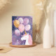 Whimsical watercolor birthday card featuring a white unicorn with a pink mane and golden horn, surrounded by pink and gold balloons on a dreamy purple background. Perfect for kids, fantasy lovers, and magical celebrations.