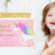 Unicorn birthday invitations with gold glitter stars and magical rainbow colours! Text in gold and pink, with a white and gold unicorn and rainbow against a soft pink background.