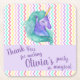 Magical Unicorn Chevron Pastel Kids Birthday Party Square Paper Coaster . The design has a pastel chevron pattern background with a cute blue green unicorn and a personalised thank you message written in a pretty font . A must for a perfect unicorn birthday party . Customise it by changing the name of the birthday Boy / Girl and the milestone year. This is part of a collection . For any further customisation , feel free to contact me at mypaperlove2021@gmail.com.