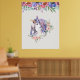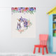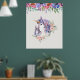 A poster with an elegant watercolor illustration featuring a watercolor mum and baby unicorn with purple mane and forelock. Delicate orange flower blossoms surround the pair. A watercolor floral bouquet along the top border.