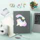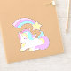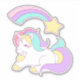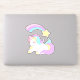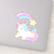 A vinyl decal with an adorable white unicorn with pastel green, purple, yellow and pink curly mane and tail. This magical creature is laying down sleeping peacefully with a rainbow coloured shooting star flying above