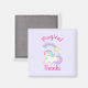 A thank you magnet with an adorable white unicorn with pastel green, purple, yellow and pink curly mane and tale. This magical creature is laying down sleeping peacefully with a rainbow coloured shooting star flying over her head. Text says "Magical Thanks" in a pink trendy font. Pastel purple background.