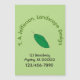 Green leaf with business info. Replace green graphic leaf with your business logo. Above leaf is line of curved text in green. Beneath is place to personalise with address and phone number in black. Pale green background may also be customised.