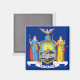 Crafted with attention to detail, this magnet proudly displays the flag of New York, featuring a deep blue field with the state coat of arms in the centre. The coat of arms includes symbols of New York's historical roots and resources: a sailing ship, the goddess Liberty holding a staff with a liberty cap, and an American eagle.
