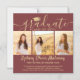 Share the joy of a high school or college graduation with custom 3 photo collage burgundy and gold square magnetic announcements. The pictures and wording on this template are simple to personalise, and the colours are easy to change with the Zazzle design tool. Include any details of your choice, such as party invitation info, special honours, degree title, favourite inspirational quote, graduate's contact info, or plans for the future. The magnetic backing makes them easy for family and friends to display. The modern maroon red design features a faux foil mortar board cap, elegant script calligraphy, traditional typography, and three photos of your choice, such as senior pictures or images from the commencement ceremony. Please note that gold is printed colour, not metallic foil. This chic magnetic graduation card is a stylish and unique way to announce a special day celebration. Congratulations to the graduate!