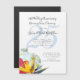Modern and trendy magnetic invitation to a renewing vows ceremony with a tropical theme. Flat invitations come in three sizes and are decorated with plumeria, hibiscus, and bird-of-paradise flowers. A big number (for years married) can be added in light blue to the background, or delete the sample number.