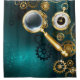 An antique magnifying glass with golden handle and convex lens on green background with gold gears and an antique clock. Steampunk style.