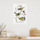 This painting is of a trio of warblers sitting on a flowering tree. This warbler has a yellow body with black and white wings and tail. The head is white with a black cheek patch on the males.