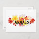 Bright watercolor plumeria flowers in reds, oranges and yellows with Mahalo (thank you) text