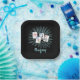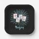 Paper party plates with Mahjong game tiles and blue sunburst on black background and customisable text.