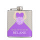 Elegant graphic Maid of honour dress in purple holding a posy of purple lilac stylised roses wedding hip flask. Reads Maid of Honour Melanie. Personalise with your own name and title A great gift idea for bridal showers, hen nights or wedding rehearsals.