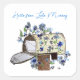 Stickers with an illustrated mailbox and custom text. Use as an envelope seal in size 3" or 1.5". Buy in bulk, or by the sheet. The mailbox is my own hand-drawn artwork. The mailbox door is open and letters can be seen inside. A pretty, blue-flowering vine climbs up the wooden post and wraps around the mailbox. Sample wording is, "Hello from - location" or personalise with a first name, family name, or short saying.