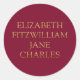 Sticker featuring the first names of the major characters from Pride and Prejudice by Jane Austen: Elizabeth, Fitzwilliam, Jane, Charles in faux gold against a reddish purple background. Perfect sticker for book lovers and fans of Jane Austen.