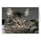 Grey tabby Maine Coon cat mix face looks out from this photo greeting card, his chin almost buried in his ruff or mane.