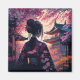 Computer generiertes Design einer Geisha in einem Kirschblüten Zauber. Abbildung einer Frau mit einer hübschen Hochsteckfrisur und Blüten im Haar welche einen Kimono trägt. Japanisches Design im AI - Midjourney Style. Im Hintergrund Japanische Gebäude.