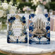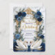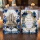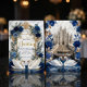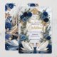 Set the tone for a grand fairytale union with this majestic cathedral design. Features elegant swans, royal blue florals, and ornate baroque detailing.This design features a digital illustration of a grand cathedral interior reminiscent of the Duomo di Milano, featuring a sweeping staircase and a white marble floor. At the center, two white swans curve their necks to form a heart shape within a tiered fountain, accented by a printed gold glitter water effect. The scene is framed by an ornate baroque archway draped in navy and dusty blue roses with faux gold metallic leaves. The typography combines elegant gold calligraphy with classic serif fonts against a cream and white background.This is a flat printed image with a faux foil and glitter effect, not actual raised material or real metallic foil.
