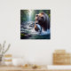 large bear is depicted in a painted art piece, holding a fresh fish firmly in its mouth. The bears powerful presence and natural hunting instincts are portrayed vividly in the artwork.