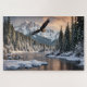 A majestic bald eagle soars over a river in winter, with snow-laden trees and glacial mountains in the background. A perfect jigsaw puzzle for anyone who loves wildlife, nature, and the outdoors.