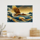 A painting showcasing an eagle in flight above a crashing wave, depicted in a beautiful abstract style with intricate wood carving, oil paint, and hints of gold and marble. symbolising strength, patriotism, and freedom.
