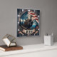 A powerful eagle soars above a serene water body, framed by mountains and trees, embodying strength and freedom against a patriotic backdrop.
