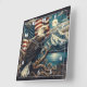 An eagle perches on a branch with mountains and a flag backdrop, symbolising strength and freedom in a vibrant, artistic setting.