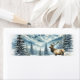 A majestic elk stands in serene winter wilderness, surrounded by snow-covered mountains and evergreen pine trees. The scene captures the tranquillity and beauty of nature's untouched landscape.