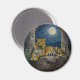 Leopard themed magnet. On the front is an illustration of a majestic leopard with fur like molten gold, laying on a cliff ledge bathed in ethereal moonlight. Intricate carvings adorn crumbling stone pillars, and bioluminescent flora casts a soft, otherworldly glow. The scene is rendered in a rich, textural oil painting style with thick strokes.