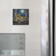 Leopard themed magnet. On the front is an illustration of a majestic leopard with fur like molten gold, laying on a cliff ledge bathed in ethereal moonlight. Intricate carvings adorn crumbling stone pillars, and bioluminescent flora casts a soft, otherworldly glow. The scene is rendered in a rich, textural oil painting style with thick strokes.