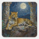 Leopard themed stickers. On the front is an illustration of a majestic leopard with fur like molten gold, laying on a cliff ledge bathed in ethereal moonlight. Intricate carvings adorn crumbling stone pillars, and bioluminescent flora casts a soft, otherworldly glow. The scene is rendered in a rich, textural oil painting style with thick strokes.