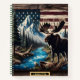 A striking moose stands proudly by a blue river, framed by tall mountains and lush forests, with a backdrop of a starry sky.