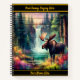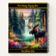 A magnificent moose stands gracefully near a colourful pond, surrounded by lush trees and a cascading waterfall in the soft glow of a setting sun, creating a serene and picturesque landscape.