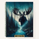 A striking moose stands proudly by a tranquil river, surrounded by dense evergreen trees under a starry night sky.