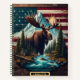 A grand moose emerges from a lush landscape, framed by mountains and a flowing river, beneath an American flag backdrop.