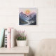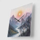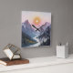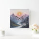 The scene is a watercolor illustration of a lovely sunset over some majestic mountains with a river flowing between the the mountains and there is a wolf that is almost hidden or slightly transparent illusion in the painting. The design is created to get a second look and find the wolf. This square clock makes for an unusual clock and will make for interesting wall art and decor.