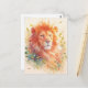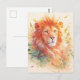 This stunning postcard features a powerful, close-up portrait of a lion with a vibrant orange and red mane. The lion's golden eyes gaze forward with intensity and grace, while its fur is rendered in warm, sun-drenched watercolor tones. Surrounding the lion is a whimsical swirl of autumn green and golden leaves that drift through the air, accented by delicate white light particles and soft peach watercolor splashes. The clean, cream-colored background creates a sophisticated feel that highlights the organic movement and rich textures of the big cat's mane. This postcard is a beautiful choice for sending a heartfelt message of strength, a thoughtful "thinking of you" note, or as a vibrant piece of nature-inspired wall art for a home office or study.
