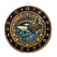 Elevate the look of your man cave or fishing lodge with this breathtaking artwork. The design captures the beauty of an orca and a turtle, surrounded by intricate golden patterns and celestial accents. The circular shape makes it ideal for placement above a dartboard, adding a unique focal point to your space.