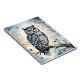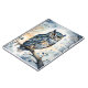 A majestic owl perched on a branch in a serene, snowy forest. The owl's striking orange eyes stand out against its blue feathers, which are adorned with intricate patterns resembling snowflakes. The background features bare trees dusted with snow, and the soft glow of the sun filters through the mist, adding a mystical quality to the scene. The overall atmosphere is tranquil and enchanting, capturing the beauty of a wintry forest.