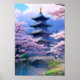 As you walk along the winding path towards the towering Japanese pagoda, you are surrounded by a sea of delicate pink cherry blossoms. The tranquil river flows gently beside you, and you can see an old stone bridge in the distance, adding to the timeless atmosphere.