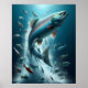1. Introducing our captivating poster, featuring a mesmerising image of a large salmon gracefully navigating the vastness of the ocean, surrounded by a multitude of smaller fish. This enchanting scene takes place in the tranquil depths of the sea, where the powerful salmon effortlessly cuts through the water, its muscular body glistening under the ethereal glow of the moonlight.