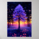 Amidst the embrace of a lush forest, stands a majestic purple tree, its unique hue contrasting with the vibrant greenery. As the day draws to a close, a charming orange sunset peeks between the trees, casting a warm glow upon the landscape. This digital artwork captures the enchanting scene of the purple tree amidst the forest, with the charm of the setting sun adding an ethereal touch to the picturesque setting.